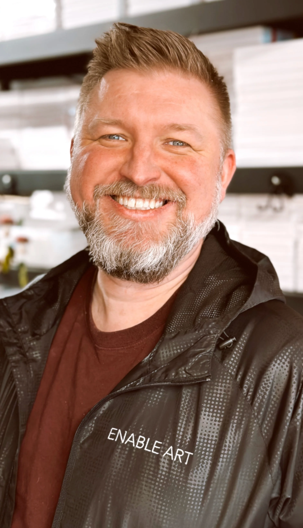 Kelsey is an essential part of the Enable Art team, and we’re incredibly lucky to have her! She wears many hats around the studio: receptionist, classroom assistant, opener, cleaner, and go-to problem solver. If the studio looks spotless when you walk in, that’s thanks to Kelsey’s dedication and care. She’s the one who keeps everything looking beautiful and running smoothly behind the scenes.